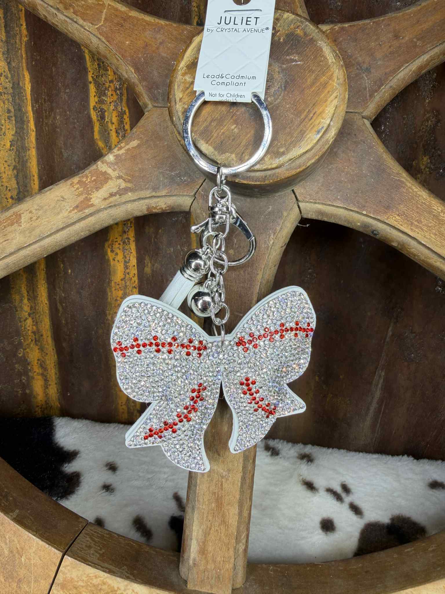 A classic bow-shaped keychain covered in clear crystal rhinestones with red baseball stitching details. Set on a silver base with silver hardware for a clean, sporty, and eye-catching finish.