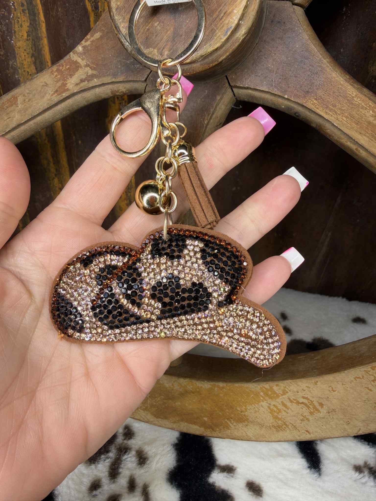 A cowboy hat–shaped keychain designed with leopard-inspired rhinestones in brown, tan, black, and champagne tones. The curved brim and shimmering texture give it a stylish, outdoorsy vibe.