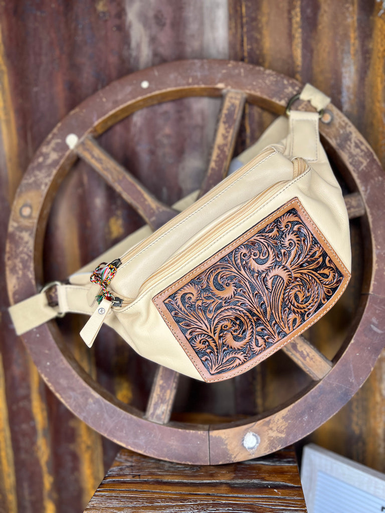 This beautiful waist pack features stunning hand-tooled leather paired with gorgeous buttercream leather. The ample interior has a zippered pocket, with zipper top close. The adjustable waist belt is in matching durable woven canvas. An amazing piece you'll cherish!