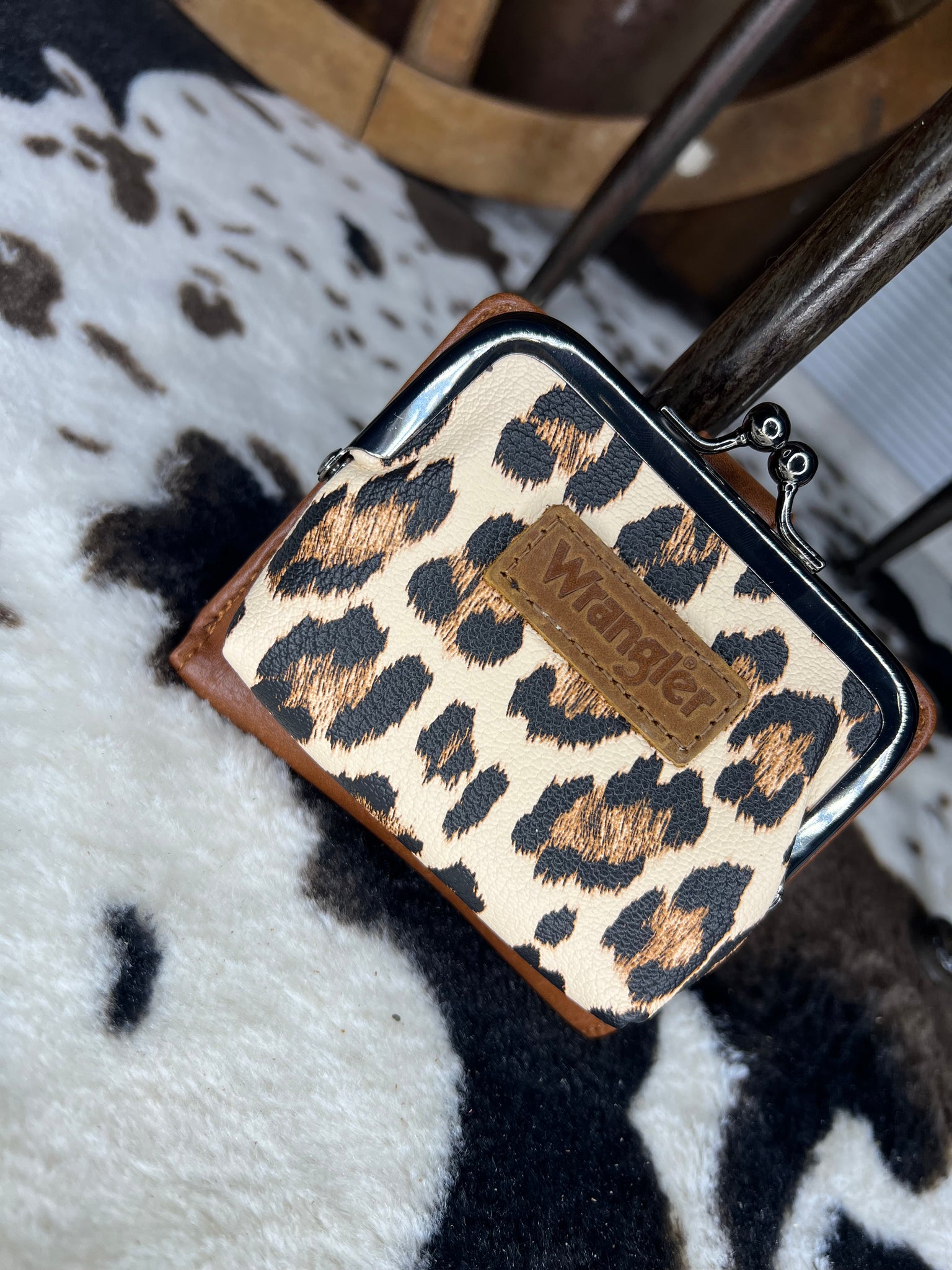 Available in Leopard Brown and Leopard Cream, each style is accented with coordinating faux leather trim and signature Wrangler detailing. Perfect for tossing in a purse or carrying on its own when you want something small but functional.