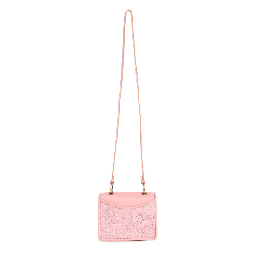 Simply amazingý this shoulder bag is a delicate fusion of femininity and artistry. This charming pink leather bag showcases exquisite hand-tooled floral designs, adding a touch of vintage elegance to your look. With its compact size, it's the perfect accessory for the woman who appreciates timeless craftsmanship and subtle sophistication in her everyday style. Top flap snaps closed.
