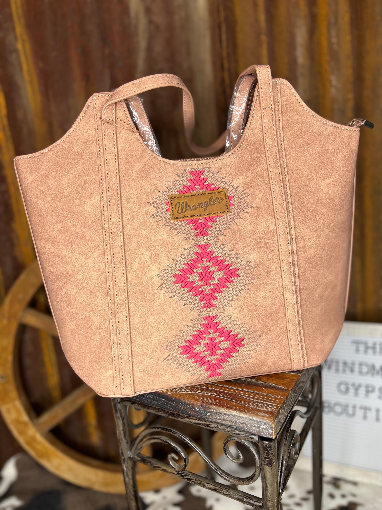 The Saddle Blush Aztec Wrangler Tote is the perfect mix of western charm and soft color. Made in a warm saddle blush with a bold hot pink Aztec pattern down the center, this tote adds just the right pop while staying neutral and easy to style. Finished with matching tan handles and classic Wrangler branding, it’s structured, roomy, and ideal for everyday carry—whether you’re running errands or heading out for the day.