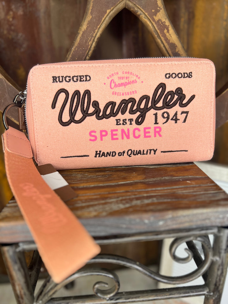 This blush pink Wrangler zip-around wallet is equal parts western and girly. Featuring bold black script with pops of hot pink and a matching wristlet strap, it’s functional and fashionable for everyday use.