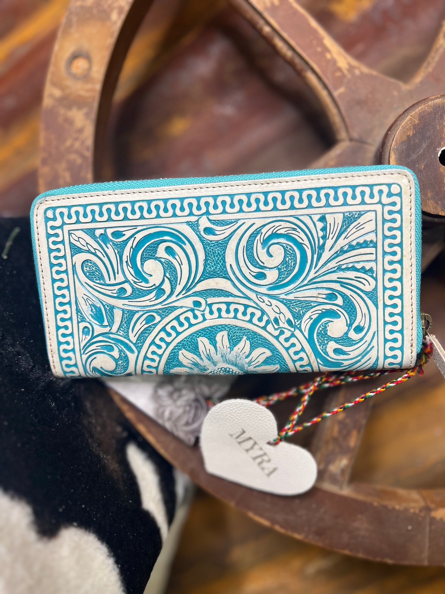 This gorgeous wallet is a lovely statement of elegance and organization. This beautiful white contrast turquoise leather masterpiece features exquisite embossed floral designs, blending vintage charm with modern sophistication. With its spacious interior, multiple card slots, and secure warp-around zipper closure, it's the perfect accessory for the woman who demands both style and functionality in her everyday accessories!