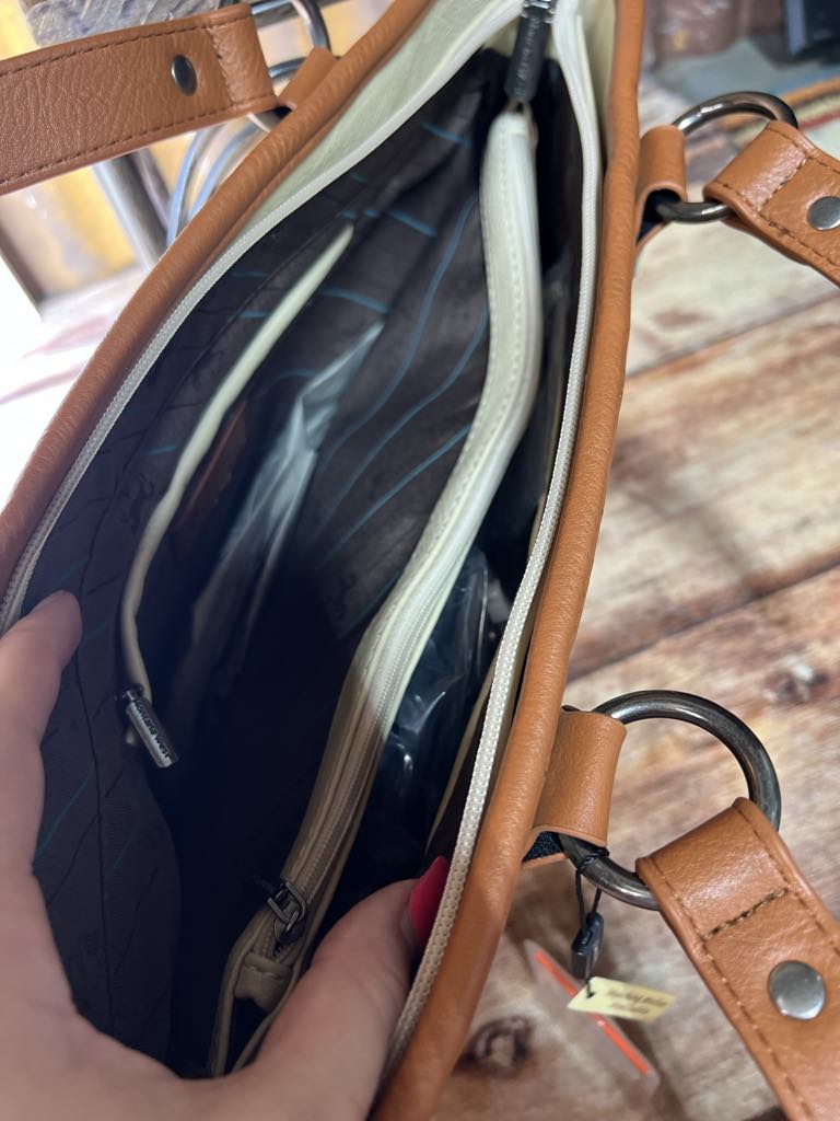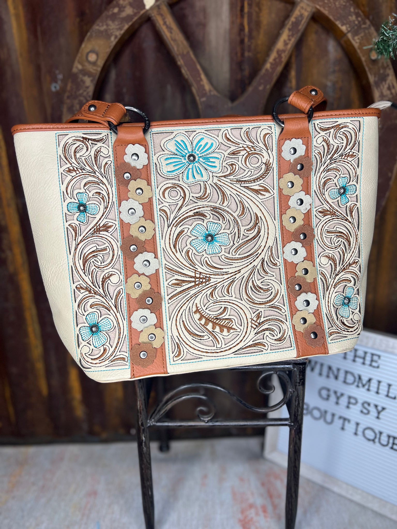 Brighten up your day with this floral tooled tote in cream and tan tones. Finished with turquoise accents and intricate swirls, it’s a beautiful mix of western artistry and everyday functionality.