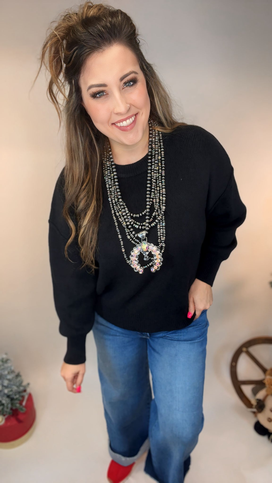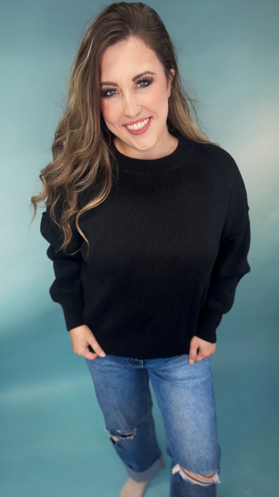 Step into timeless elegance with the Midnight Luxe Ribbed Sweater. In a classic black hue, this sweater is designed with a ribbed texture that adds a subtle sophistication to any outfit. The relaxed fit and soft fabric ensure comfort while maintaining a polished look.