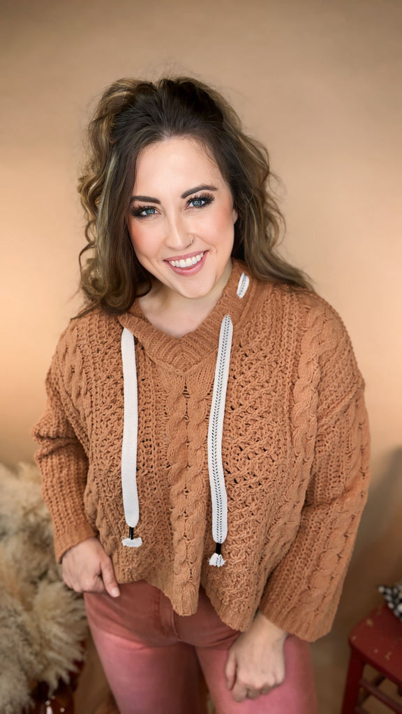 So soft it’s unreal. The Haven Hooded Sweater is the definition of cozy-chic — with a chunky cable knit, slouchy drawstring hood, and cropped fit that hits just right. Perfect for layering or lounging, this one’s made for crisp mornings, coffee runs, and lazy Sundays.