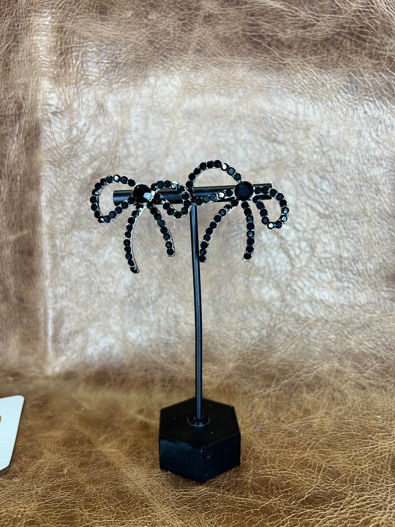 Add some sparkle to your cowgirl look with our Rhinestone Rodeo Bow Earrings! Available in bold red or classic black, these glitzy earrings feature a twirled bow shape made entirely of shimmering rhinestones. Lightweight and full of sass, they're the perfect pop of fun for game days, rodeo nights, or girls' night out.