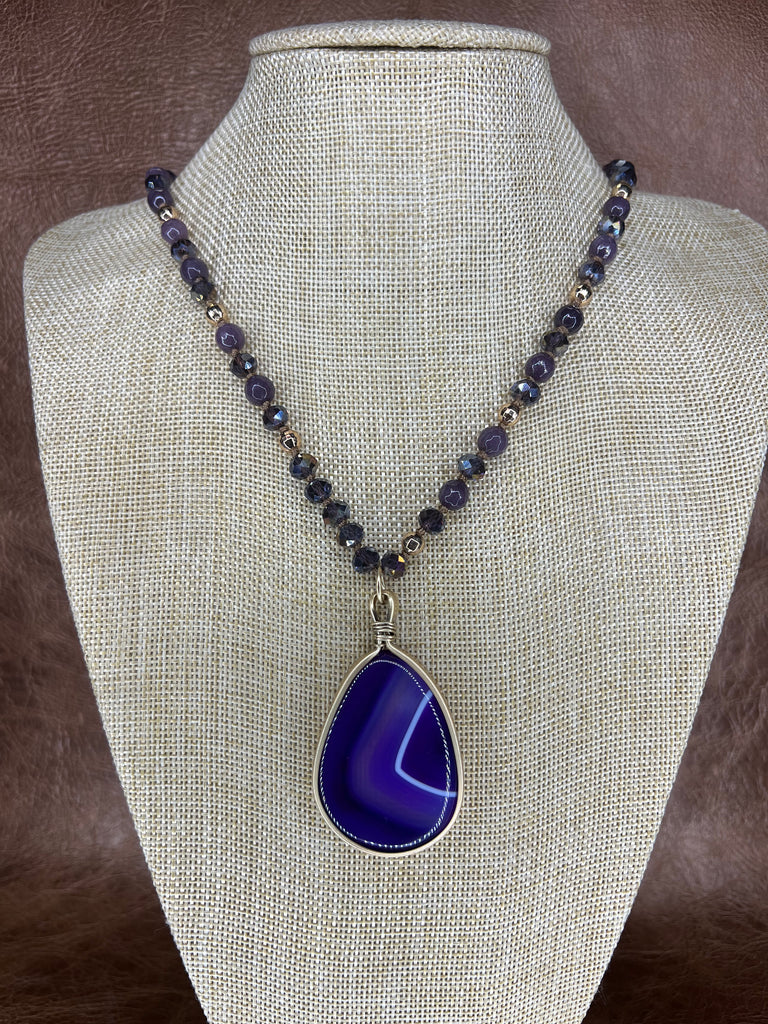 Make a bold statement with the Violet Vibes Agate Necklace. This beauty features shimmering faceted beads in deep purples and gold tones, leading down to a stunning teardrop-shaped purple agate pendant framed in gold wire. The natural stone swirls make each piece one-of-a-kind. Whether you're dressing up or keeping it casual, this piece brings the perfect mix of earthy glam and rich color.