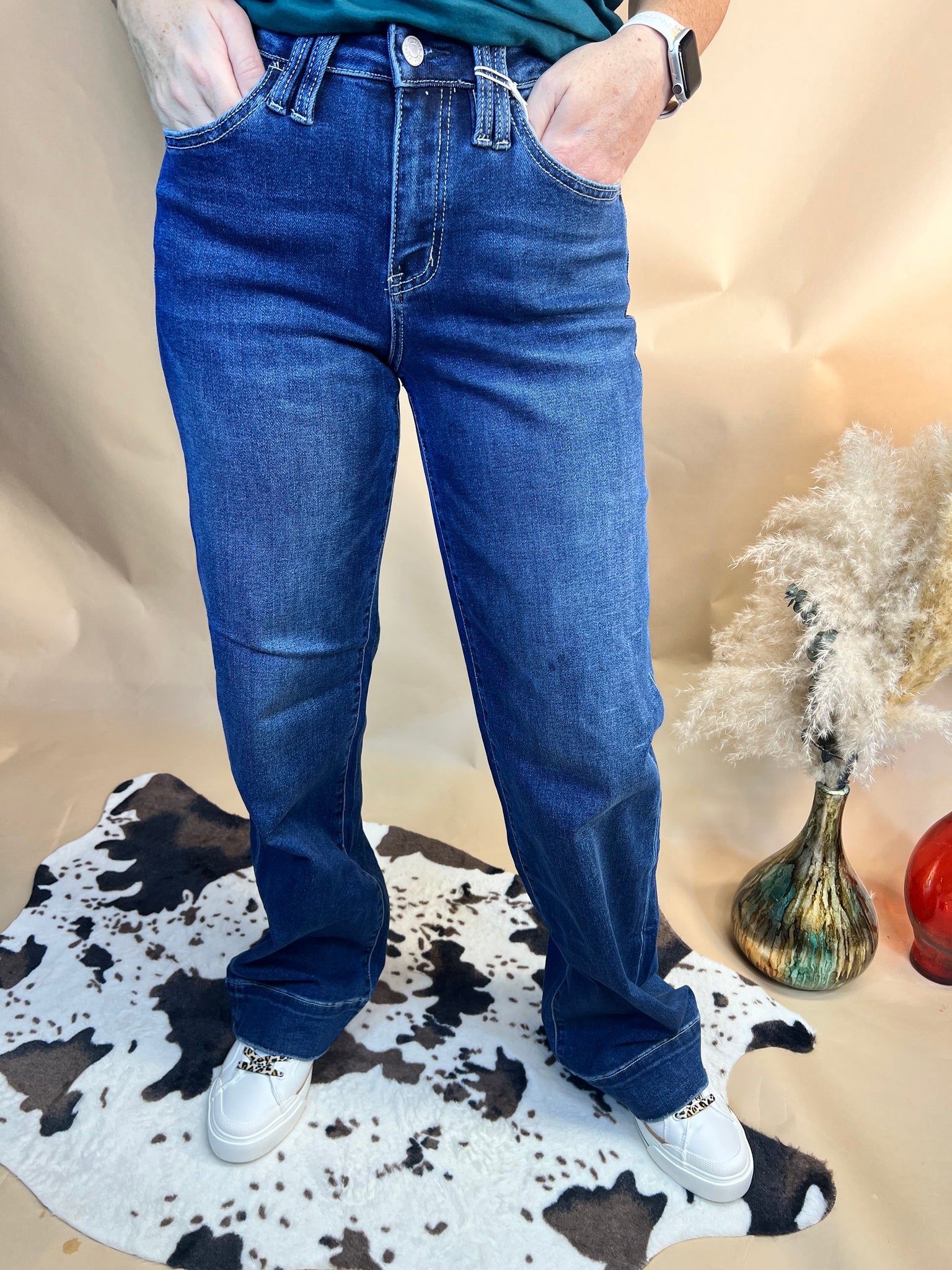 The Brinley Jo Trouser Jean is made for the girls who live in the show ring and the rodeo arena. With a sleek dark wash, high-rise fit, and wide-leg trouser cut, these jeans give you the perfect mix of Western grit and everyday style. Durable enough for the barn, polished enough for town, and comfortable enough to wear all day — the Brinley Jo is a true cowgirl staple.