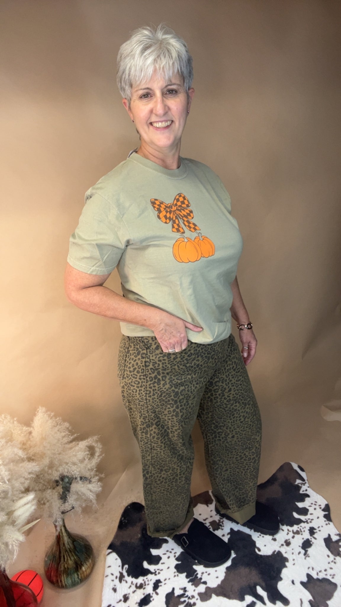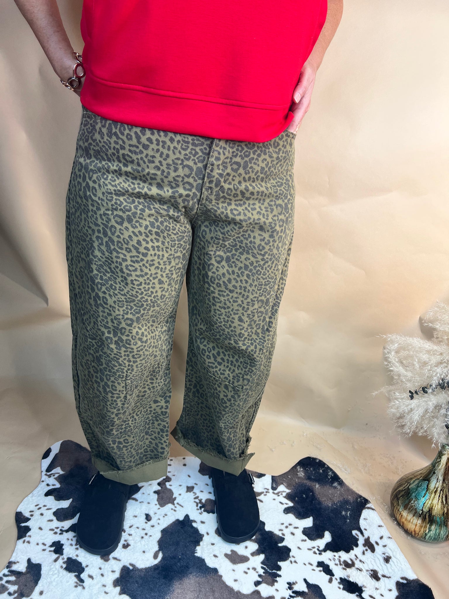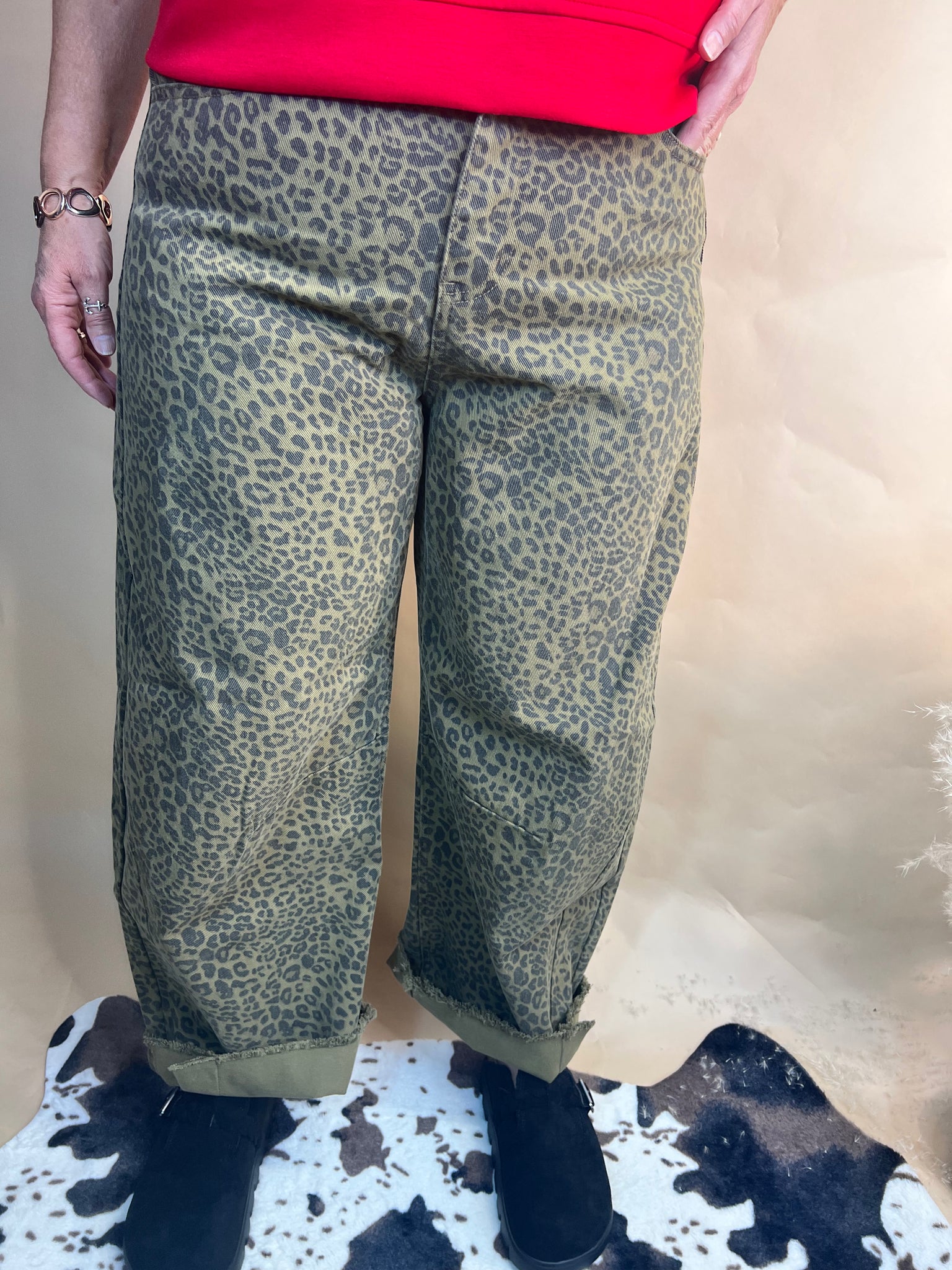 These trendy cheetah print barrel jeans are IT! Fits the body perfectly! Sleek high waisted fit design, and non stretchy denim that fits like a dream! Wide-legs that slightly taper at the ankle. Darted knees keep the "flare out" form. Features beltloops, detailed seams on sides and a raw hem that can be rolled up or down