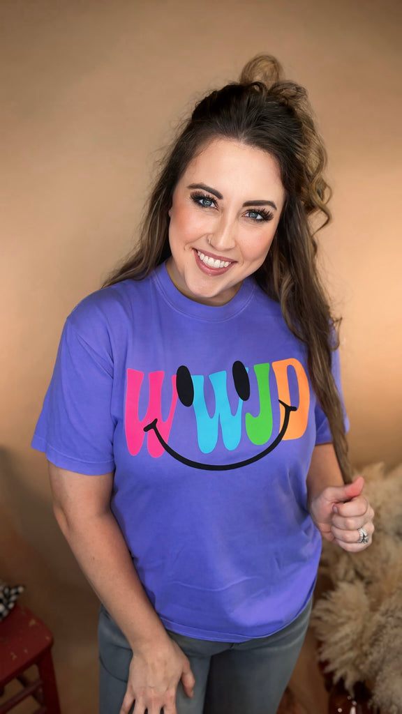 Add a little faith and a lot of vintage flair with our WWJD Smiley Tee. Printed in-house on a violet Comfort Colors tee, this one’s all about good vibes and bold reminders. The soft, garment-dyed cotton gives that perfectly lived-in feel from the very first wear, and the classic yellow smiley face paired with “WWJD” keeps things both playful and purposeful.