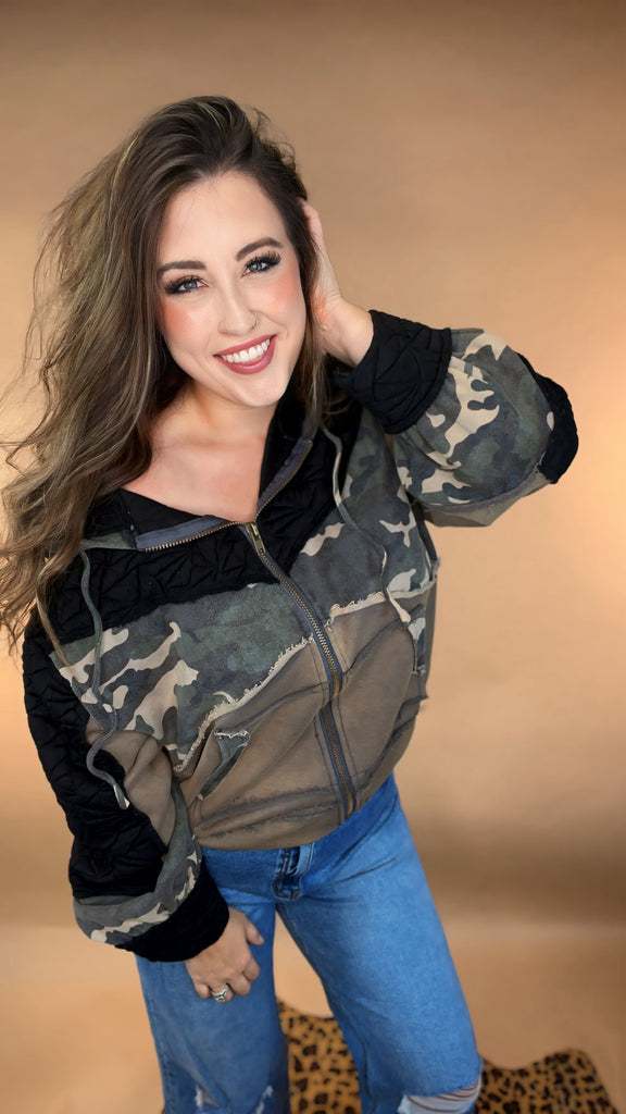 The Camo After Dark is camo redefined. Black quilted fabric pairs with camo accents, raw stitching, and a brown mineral wash for a rugged, one-of-a-kind finish. With its mix of grit and boutique style, this zip-up jacket is as bold as it is versatile — built to stand out whether you’re at the campfire or on the street.