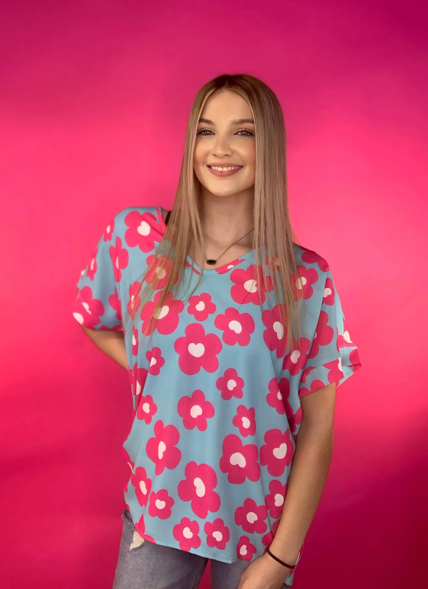 Bright, bold, and effortlessly fun, the Cotton Candy Crush Top is a must-have for adding a pop of personality to any wardrobe. Featuring an oversized fit for ultimate comfort, this lightweight 100% polyester woven top is both breezy and stylish. The sky-blue background is adorned with vibrant pink retro florals, making it a playful yet chic statement piece.
