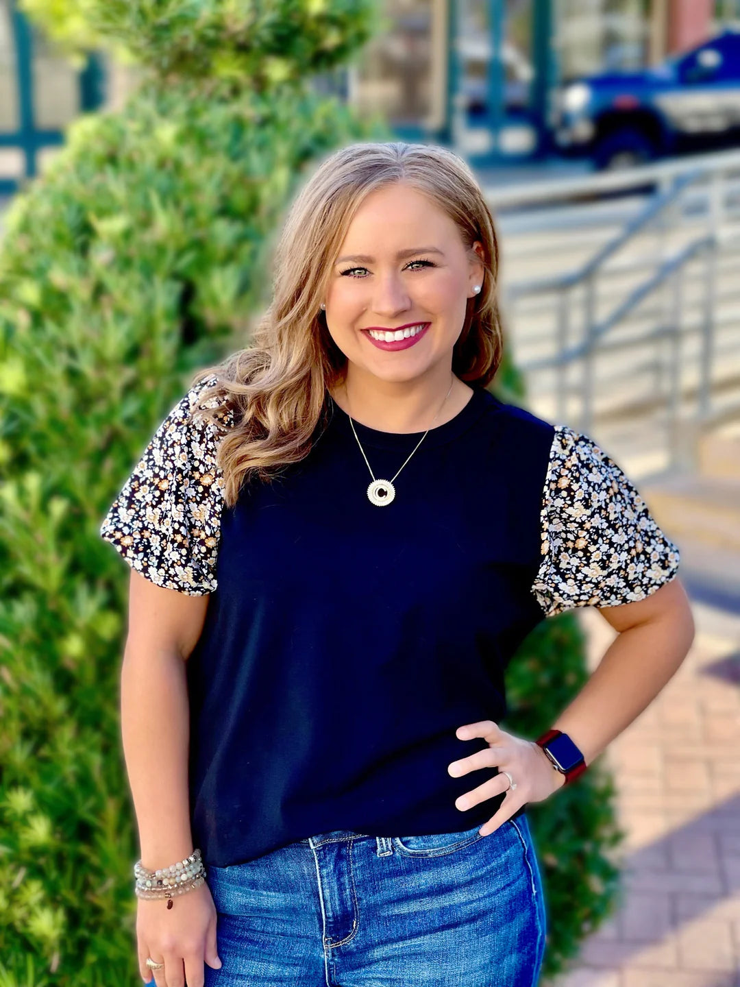 The Delilah Top is absolutely stunning! This top is one of those pieces you need in your closet for those special occasions. It is perfectly crafted from a cotton and polyester blend. Not only is this top dressy- it’s comfortable! This solid black top features floral printed short sleeves and a rounded neckline.