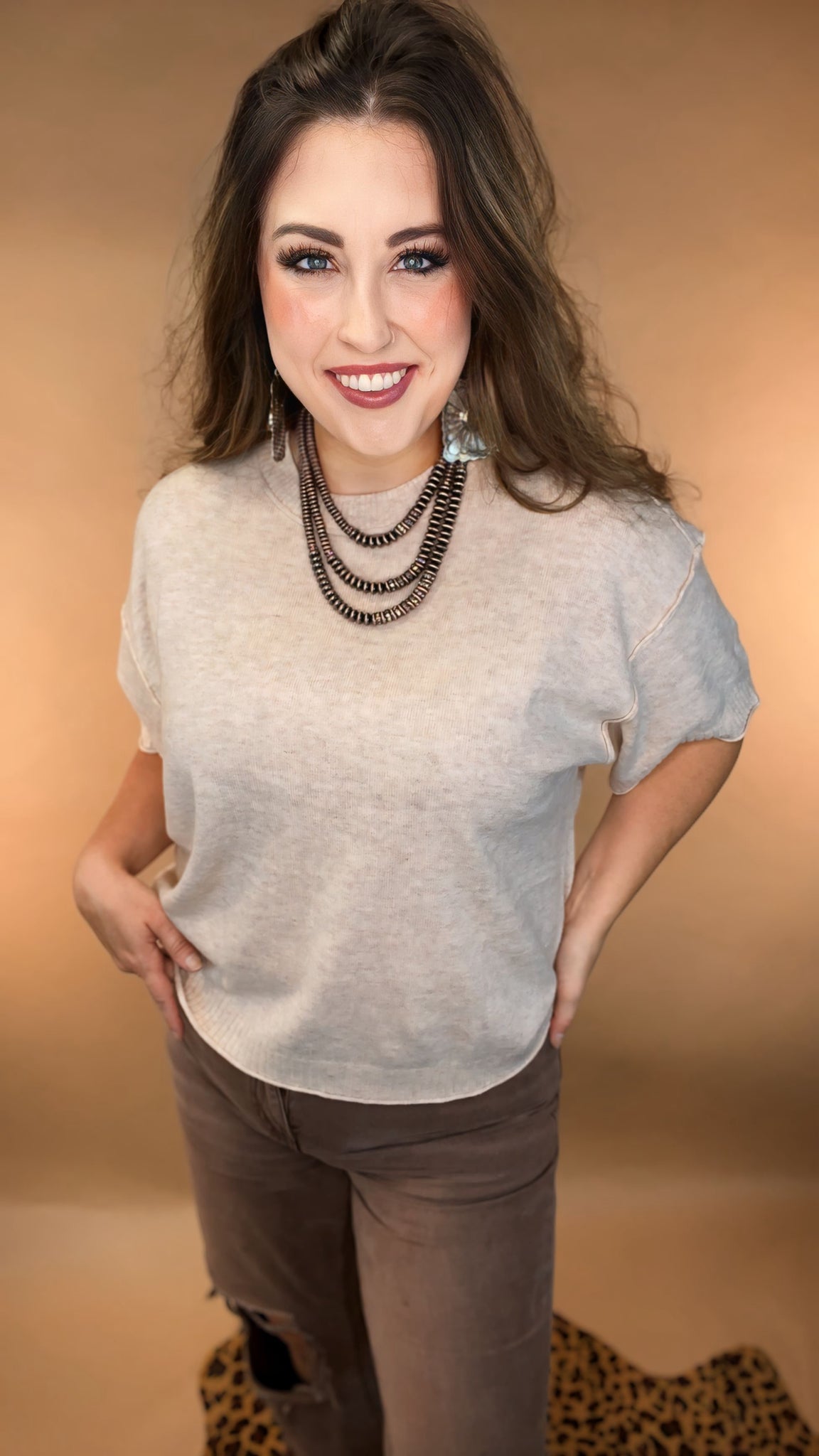 The Edge of Oatmeal takes a neutral basic and gives it an elevated twist. This oatmeal knit short-sleeve sweater is lightweight and breathable, featuring textured sleeves and a hem finished with inside-out exposed stitching. Soft, comfy, and just the right touch of edge — it’s the kind of boutique piece that looks just as good with denim shorts as it does layered for a night out.
