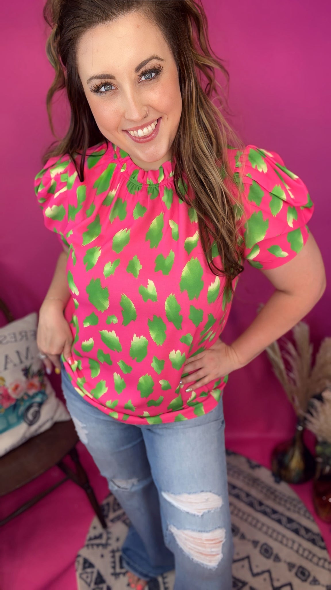 The neckline features a delicate ruffle mock neck, adding a touch of elegance while maintaining a relaxed, breathable fit. The sleeves bring all the drama with a slightly puffed design, offering volume at the shoulders that flows into a structured yet airy short sleeve. Whether paired with jeans for a casual pop of color or dressed up with trousers, this blouse is the perfect blend of fun and sophistication.