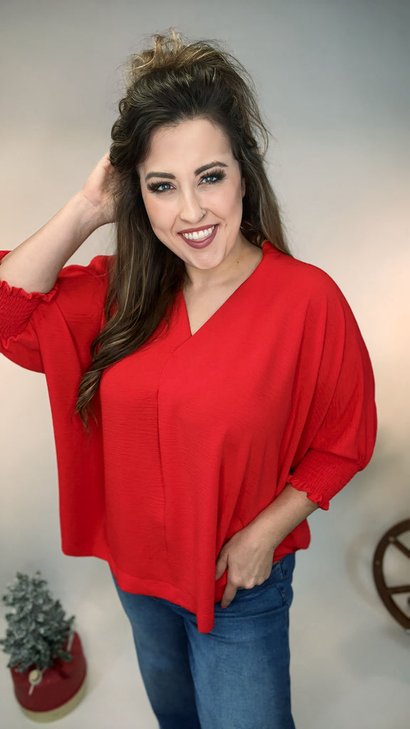 Brighten up your wardrobe with our Sunset Breeze Smocked Sleeve Top in a vibrant tomato red. Designed with a relaxed, airy fit, this top features an effortless collared V-neckline and playful smocked sleeve bands for a pop of texture. Lightweight and breathable, it’s your new go-to for sunny days, casual nights, and everything in between.