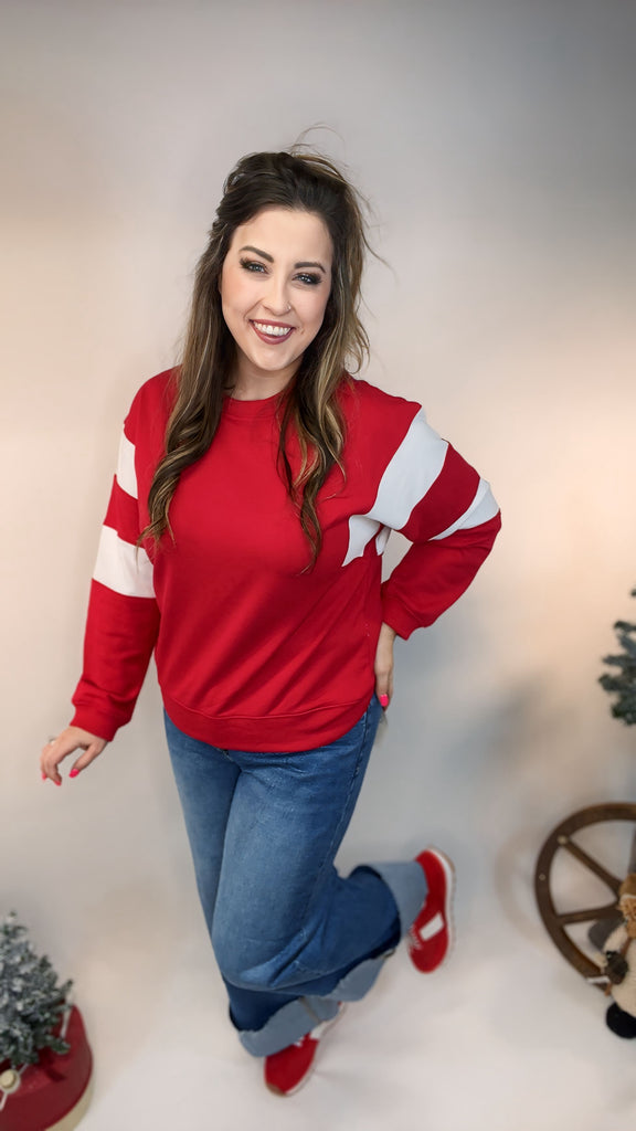 Make a bold statement in The Presley Pullover — a vibrant red, mid-weight sweatshirt with crisp white panels across the upper arms and shoulders. The contrast design gives it a sporty, retro feel that’s perfect for game days or casual weekends.