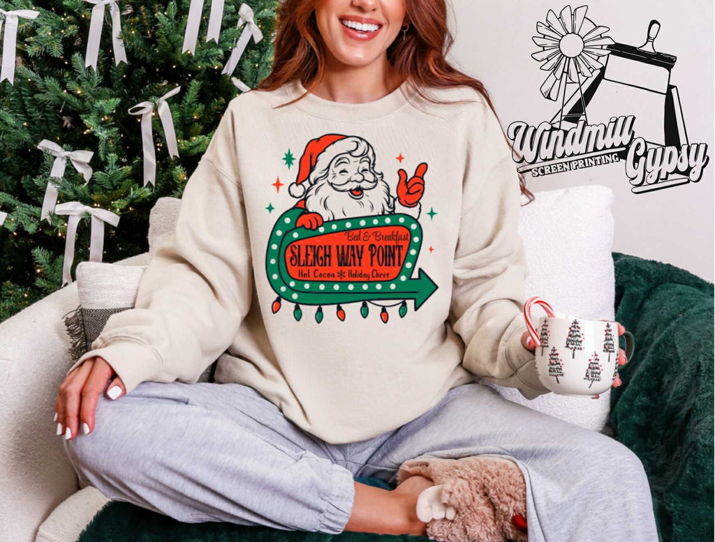 A cozy classic with all the vintage Christmas charm. This crewneck features a retro Santa and a marquee-style “Sleigh Way Point” sign for the perfect mix of festive and fun. Printed in-house on a soft cream fleece, it’s the kind of holiday sweatshirt you’ll reach for on repeat — effortless, cute, and oh-so-comfortable.